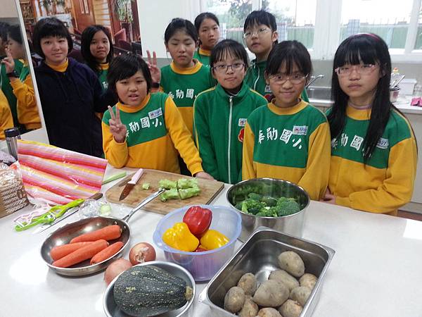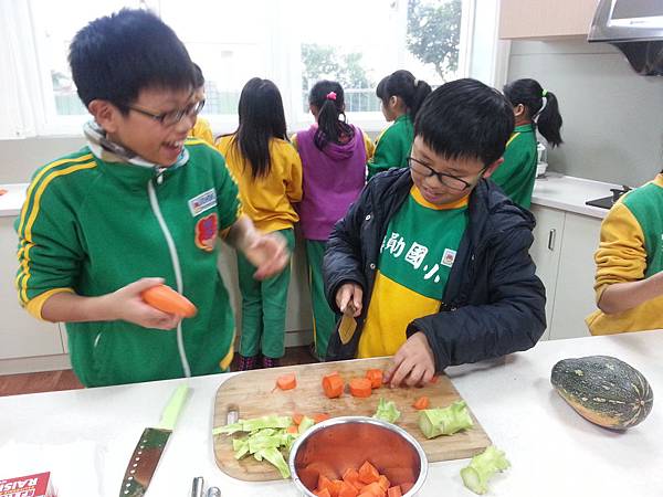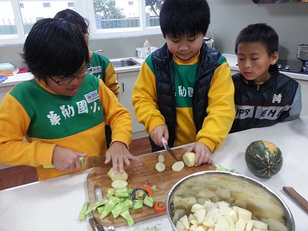 大家要分工合作,學習如何洗菜、切菜、削皮,再來將馬鈴薯、紅蘿蔔、南瓜煮熟,最後用蔬果調色。