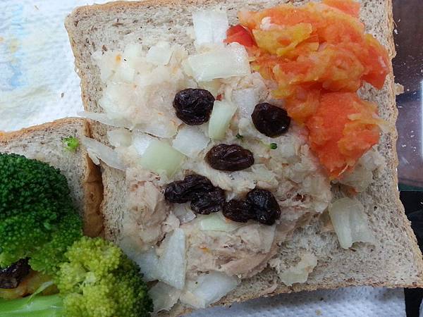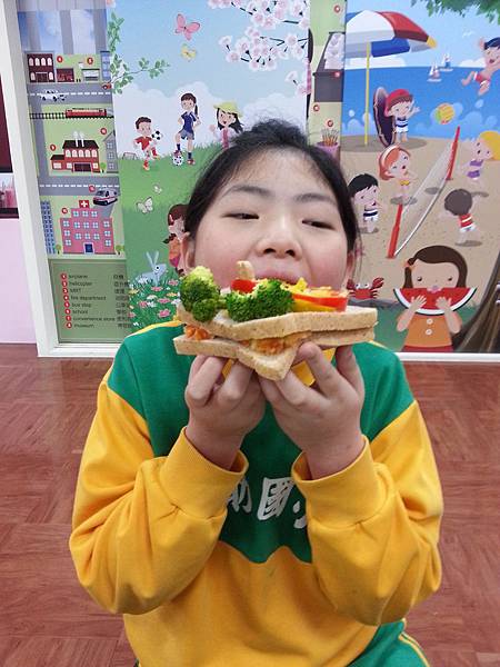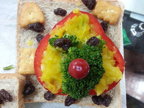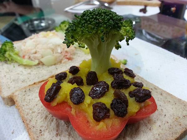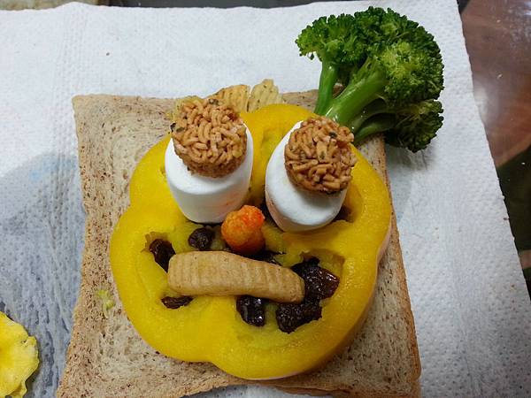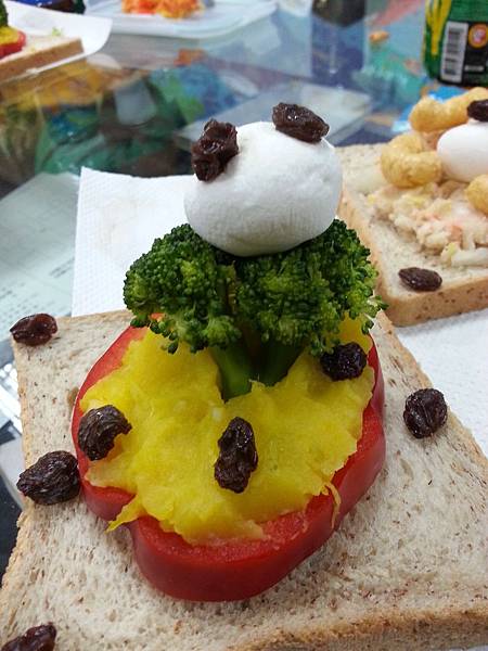 陳老師協助準備的材料很簡單:馬鈴薯、紅蘿蔔、彩椒、綠花椰菜、南瓜、鮪魚罐頭、全麥吐司、沙拉,目的是希望同學們多吃青菜蔬果;同學們要準備的「作畫材料」就依個人喜好來決定了。