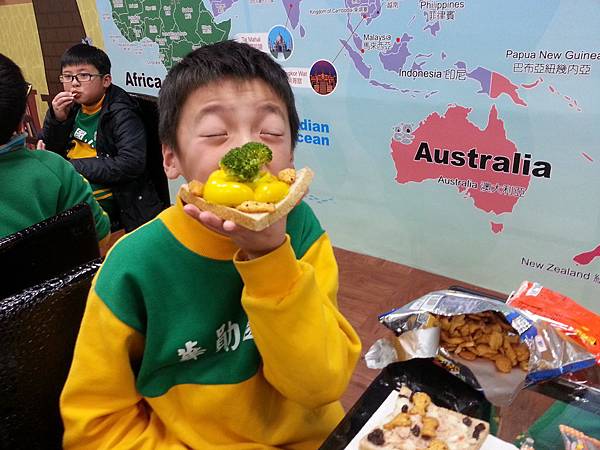 當材料都備妥之後,就是用菜作畫的時間了。這時同學們拿出自己準備的零食,除了和大家一起分享,也可以放進作品中。看是要設計一座蔬果塔,還是要設計成一座花園,總之接下來就是創意時間了。
