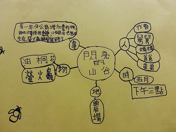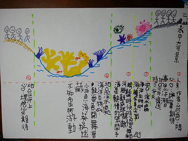 初期訓練,我會提供提問單給孩子們去思考文本的中心思想及重要訊息是什麼,讓學生以結構圖或心智圖的方式摘出段落大意或全文大意。慢慢的,我就會讓孩子們自由發揮。孩子們喜歡小組討論,我在一旁聽他們說什麼,適時給予建議。這時,我可以看到各種思維在小組討論之間燃燒,呈現的作品也多樣化,雖然有時討論結果不見得十分流暢,但是我相信孩子們的學習記憶會更深刻。當小組將作品陳列在黑板時,大家都可以看到不一樣的呈現方式,這時候就可進行評估比較,來看看哪一組的段落摘要該如何修正,是否能掌握該段落重點。老師也能理解到孩子們理解監控的能力到達哪個程度。