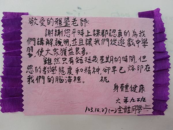 今天,這套課程暫時畫下休止符,我們準備了小小謝卡,謝謝雅瑩老師,也期待也希望每個孩子都能健康有信心的成長。