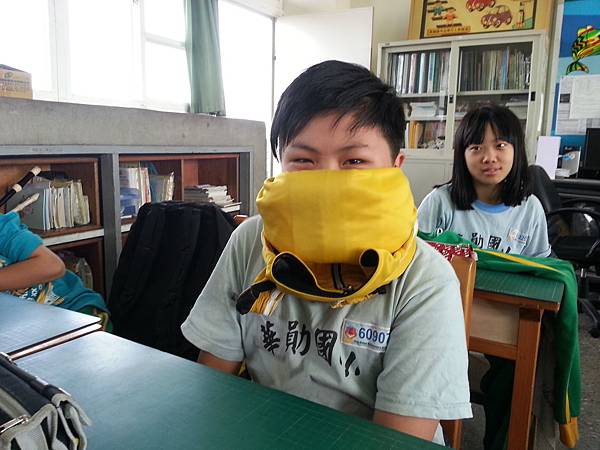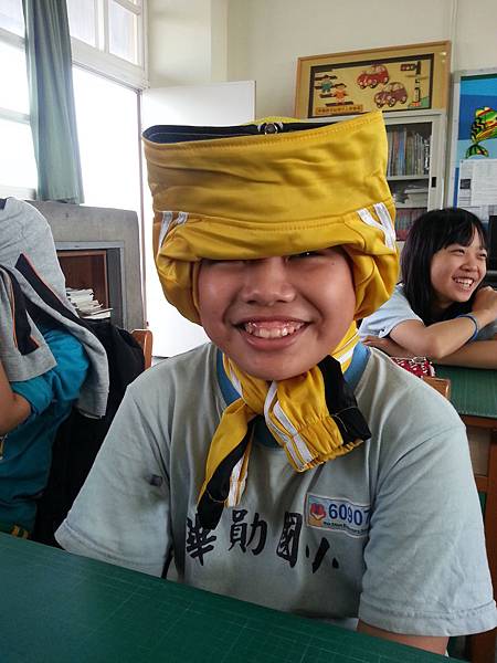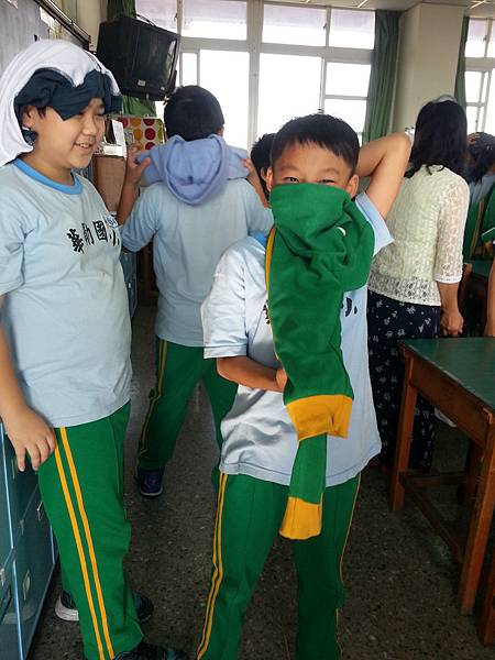 一會兒是「印度頭巾」,一下子又換成「筍子袖」,接著又出現「黑山姥姥」,忍者、防毒面具、開喜婆婆、遮陽口罩、大清格格、便當造型,創意像個頑皮小孩到處亂竄,最後還來一隻長毛象,哇,真佩服這孩子們,能把一件外套搞出這麼多花樣。