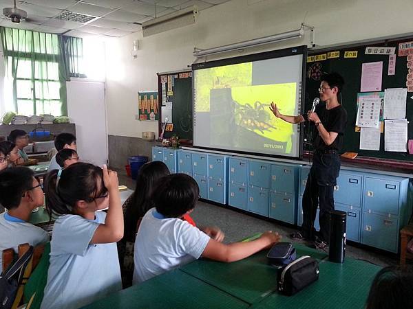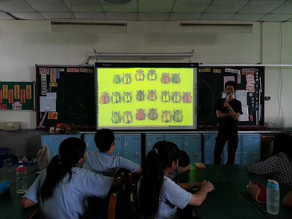 姜老師做過的標本太多了,養過的動物也太多了,短短的二堂課絕對無法一窺堂奧,因此透過一張張精彩的投影片,讓同學們聆聽各種昆蟲、動物的基本生態及活動方式。螳螂、金龜子、兜蟲、鍬形蟲、蝶與蛾、蛇與青蛙、水生動物、蜘蛛、烏龜、螞蟻、蜂與蠅...,台灣與國外品種在身形色彩之差異。對我而言,能列出上述基本名詞已經要偷笑了,昆蟲是世上最大家族耶,姜老師如數家珍的詳細講述,這場分享既精彩又令人佩服!