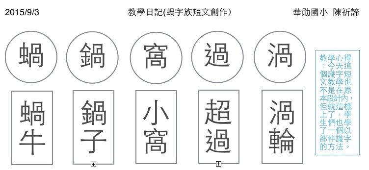 當我們在上課討論:如果把蝸字的「虫」拿走,換上別的部首,和「蝸」很相似的字有哪些?